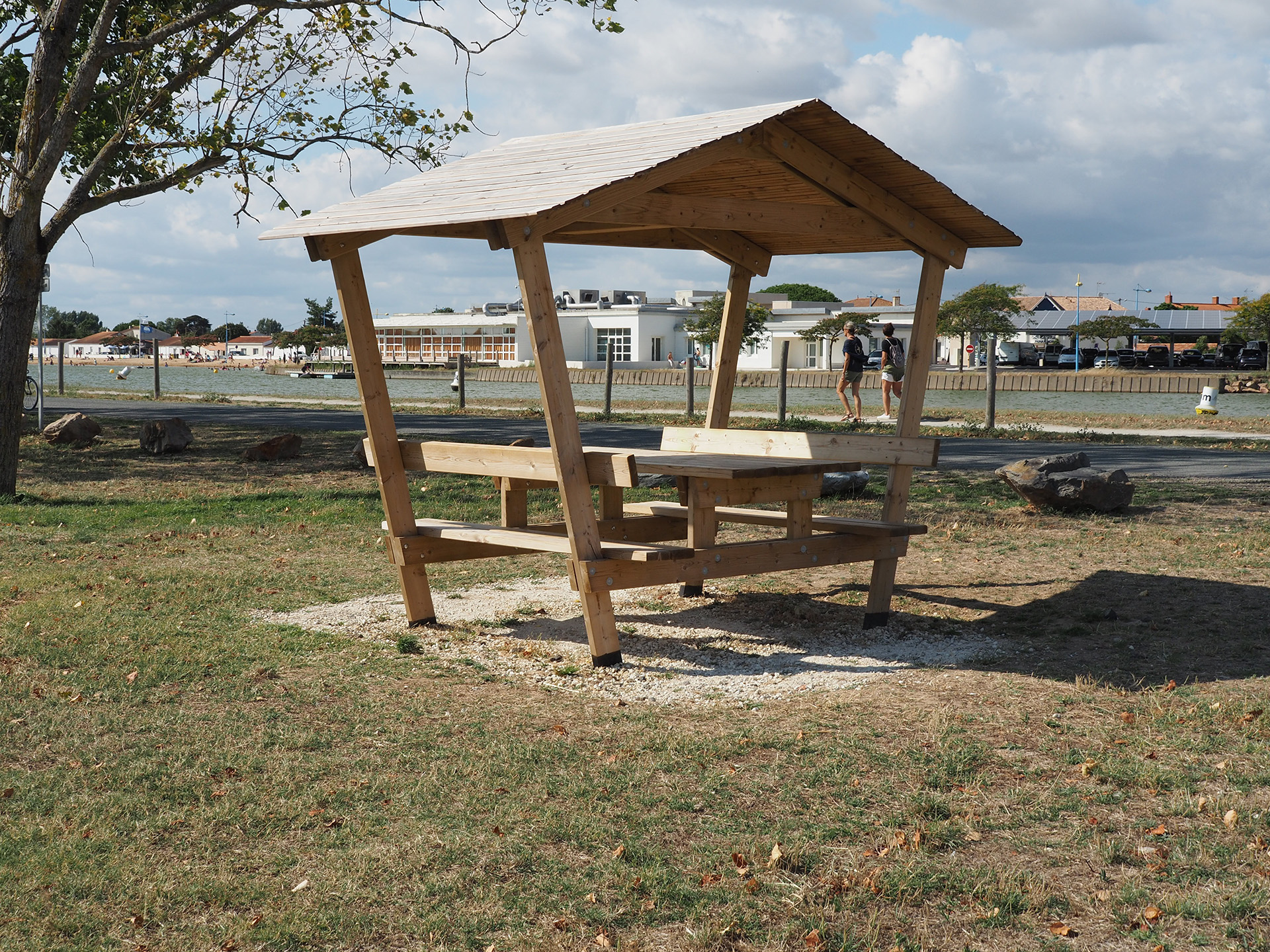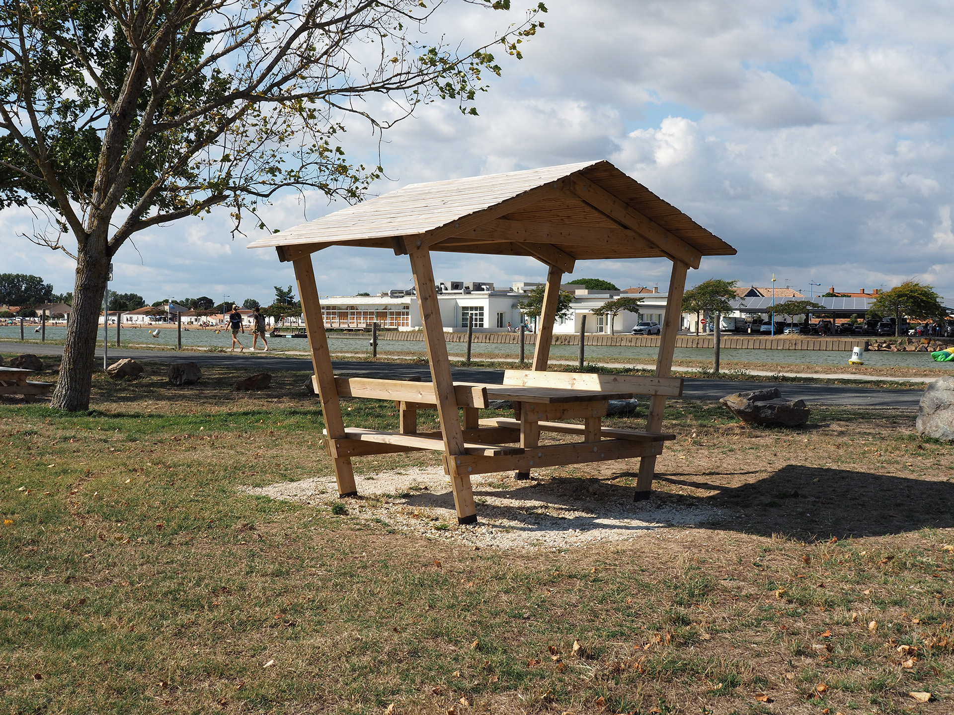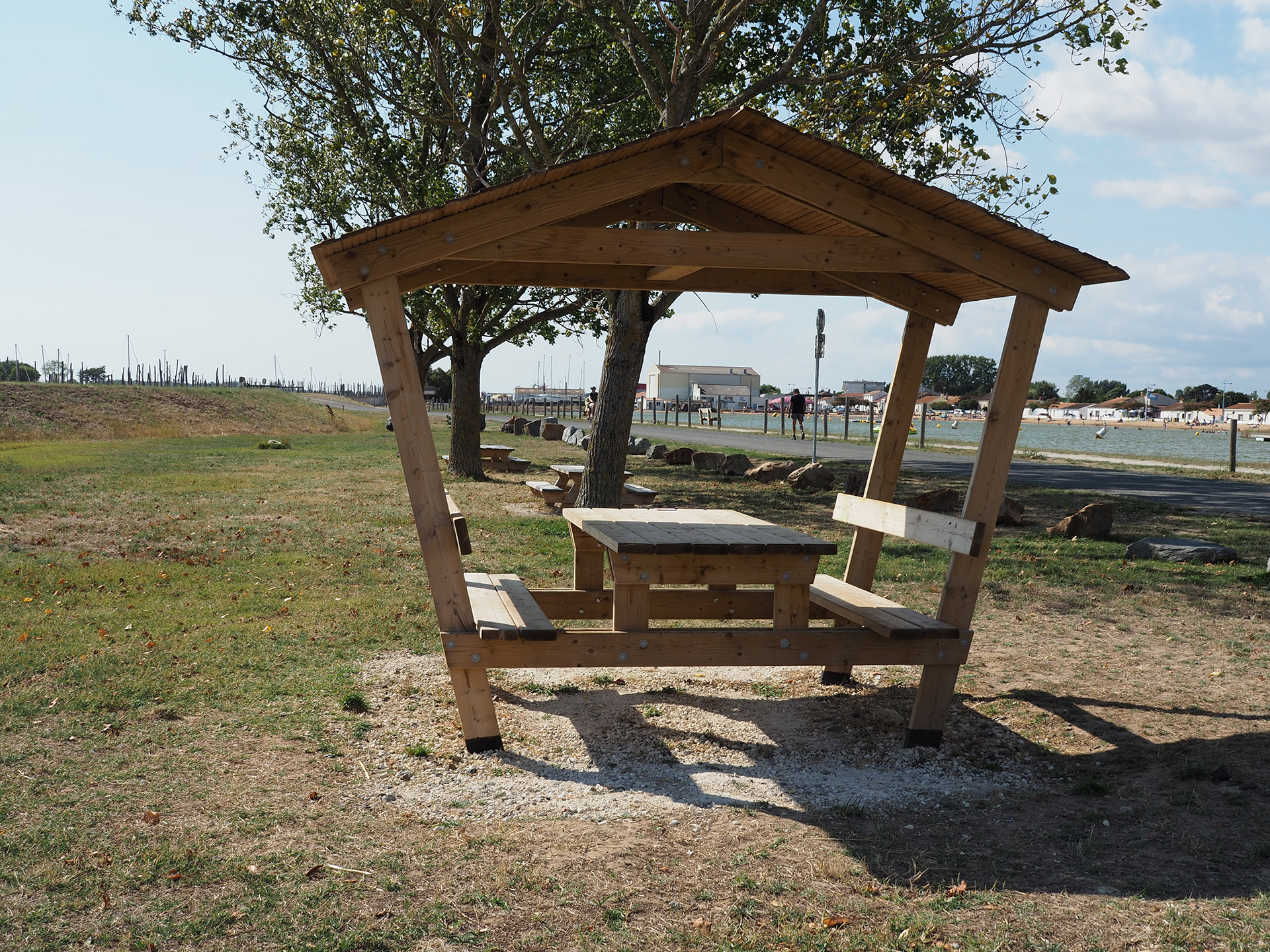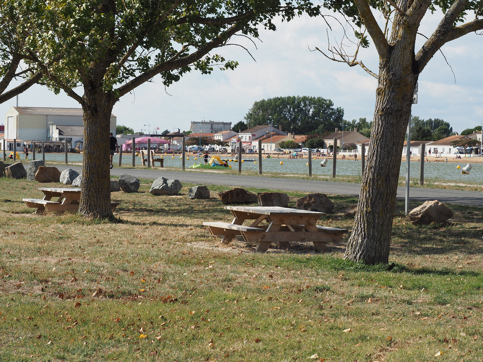 3 Picknicktische, davon einer überdacht. Schattige Lage. Blick auf den Lay, die Wasserfläche, die Wassersportaktivitäten und den Hafen.