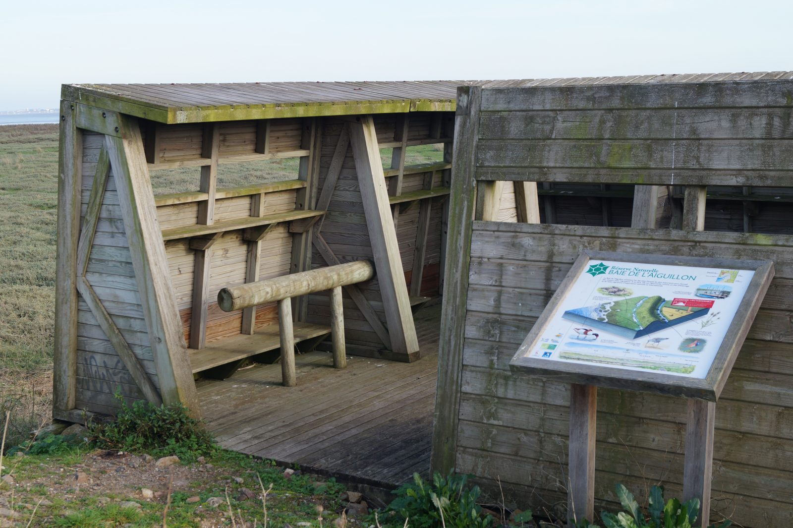 Beobachten Sie mit Ihrem Fernglas das Leben in der Baie de l'Aiguillon in diesem Observatorium, das auf dem Deich am Meer errichtet wurde.