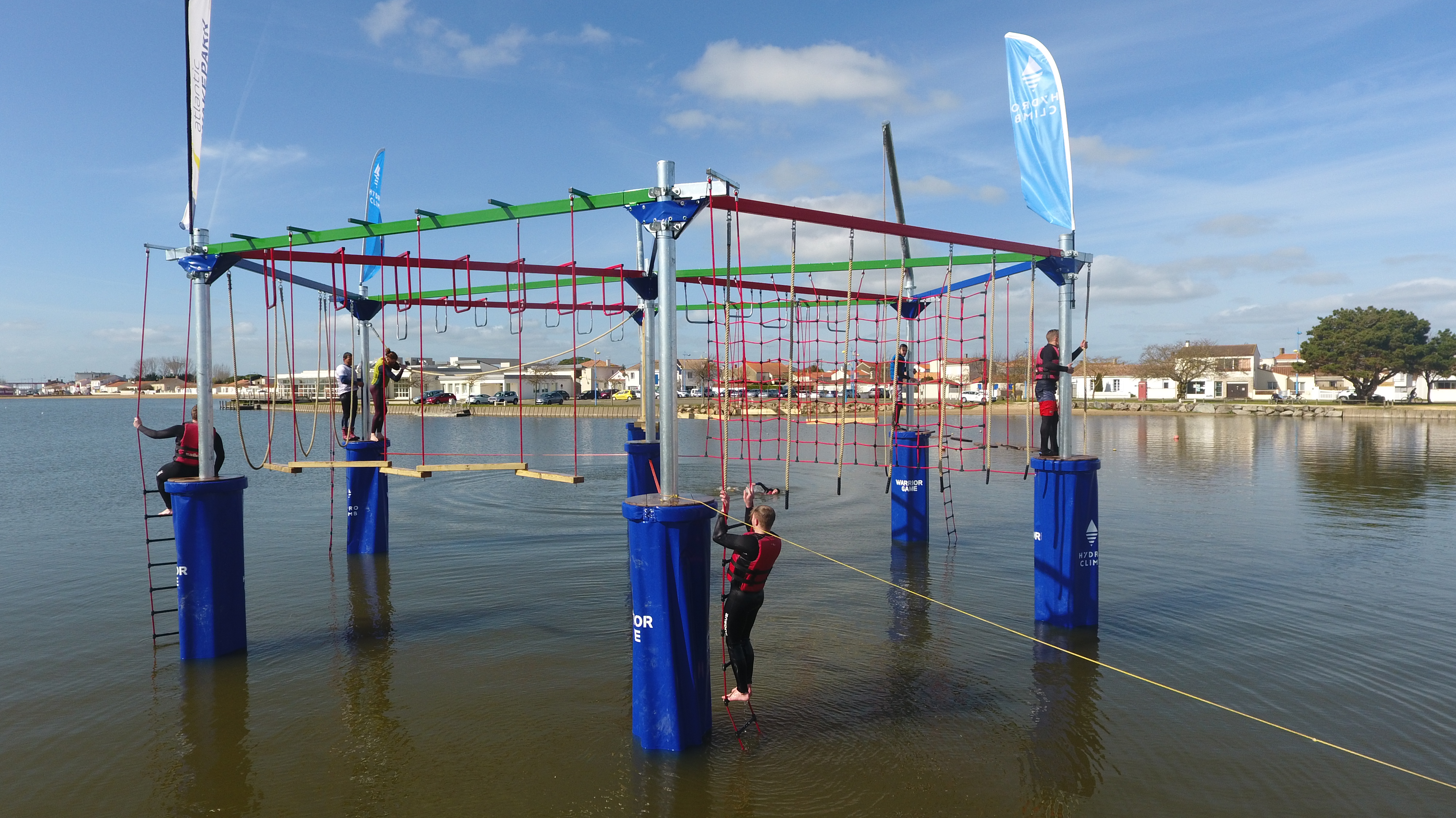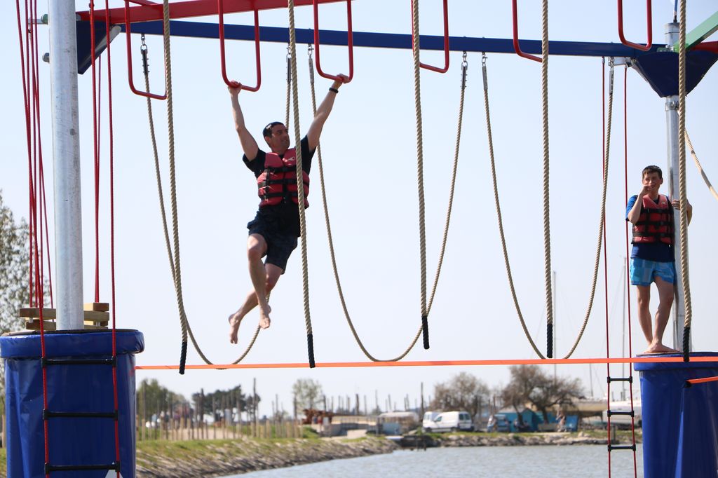 Auf dem Menü stehen Slackline, Liane, Spinnennetz, Hängestangen, Schaukeln und Rundhölzer. Ein Cocktail für Warriors, die sich der Herausforderung stellen wollen, ohne ins Wasser zu fallen.