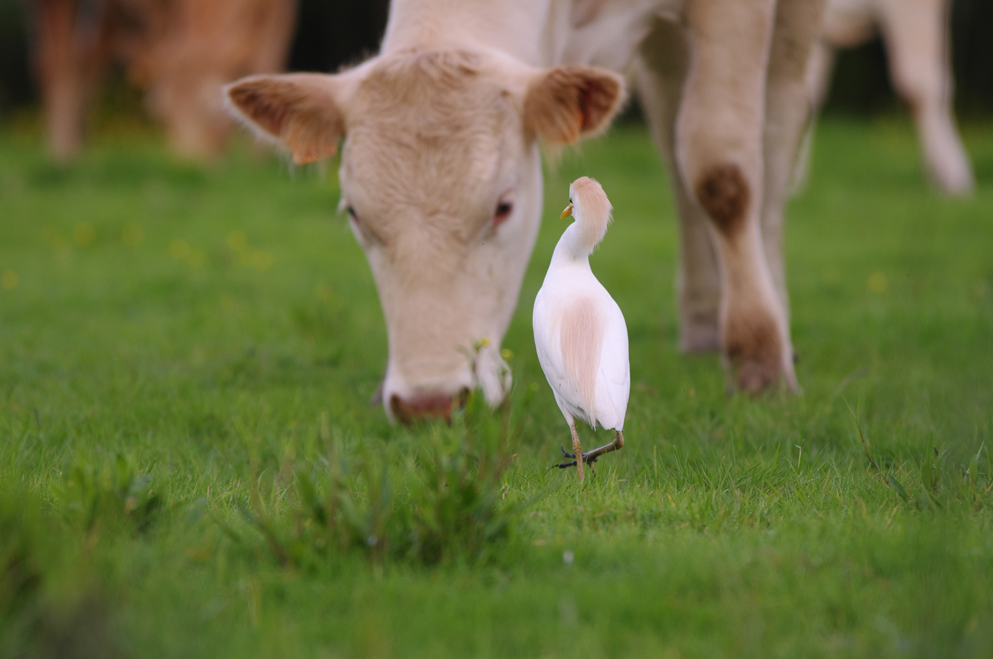 - Der Kuhreiher (Bubulcus ibis): er ist kleiner als der Seidenreiher und unterscheidet sich zusätzlich durch seinen gelben Schnabel von ihm. Man findet ihn immer in kleinen Gruppen und als Begleiter der Viehherden auf den Wiesen. Dort sucht er nach seiner Hauptnahrung, den Insekten: er hat die Aufgabe die Rinder von ihren Parasiten zu befreien!