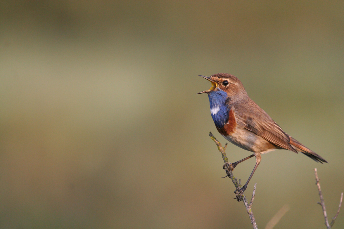 - Das Blaukehlchen (Luscinia svecica): durch die leuchtend blaue Azurbrust und den Gesang aus dem sicheren Versteck in der Höhe macht es sich bemerkbar! Zur Beobachtung sind trotzdem ein paar Bedingungen nötig: ein sonniger Tag, ohne Wind, zwischen Mitte März und Juli und vor allem Zurückhaltung!