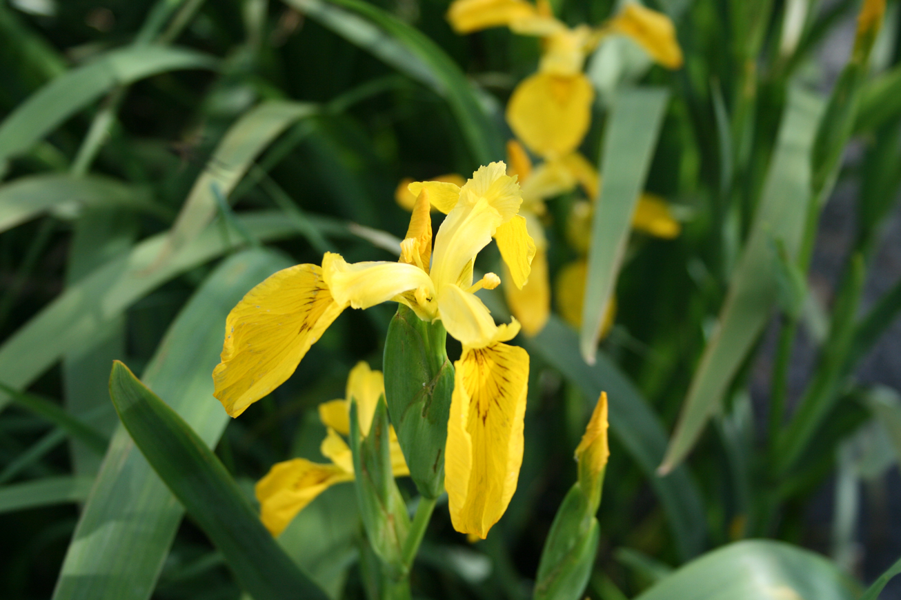 - Die Sumpf-Schwertlilie (Iris pseudacorus), Wasser-Schwertlilie oder auch Gelbe Iris genannte krautige Perenne, die man am Sumpf oder am Ufer findet. Ihre Blütezeit ist von April bis Juli. Die Lilie bedeckt die Ränder unserer Wassergräben, sie liebt die Nähe zum Wasser. Ihre Blüten bestehen aus drei wunderschönen gelben Blättern.