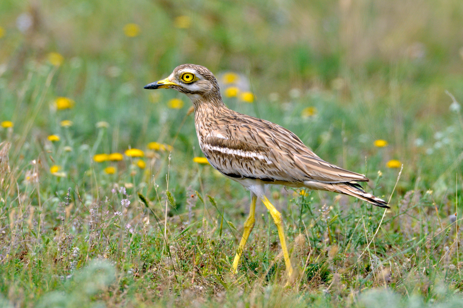 - Der Triel (Burhinus oedicnemus) kann an seiner cremefarbenen Brust mit braun-schwarzen Streifen erkannt werden. Seine Flügel haben eine braun-schwarze Färbung, ihre Unterseite ist braun mit zwei hellen Streifen. Er wird auch „Großer Landbrachvogel genannt“, da sein Ruf an den eines Brachvogels erinnert. Er ist hauptsächlich nachtaktiv und daher schwer am Tag zu beobachten. Im Sommer macht er besonders nachts viel Lärm, indem er ein langes Pfeifen von sich gibt.
