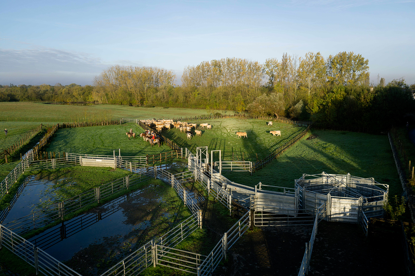 Die Gemeindesümpfe des Marais Poitevin sind große natürliche, überschwemmungsgefährdete Wiesen, die als Weide für Tierherden verwendet werden. Zudem bieten sie Zugvögeln eine Unterkunft und Schutz. Manche erreichen eine Größe von bis zu 300ha…Der Wechsel des Weidegebiets „Les touchers du communal“ ist im Frühling der Anlass zu einem großen Fest in Lairoux. Die Züchter lassen hier nicht weniger als 500 Rinder und Pferde grasen. Die andere Einzigartigkeit dieser grünen Weiden ist die Überwachung der Herden durch einen Kuhhirten (frz. éco pasteur) zu Pferd. Wenn Ihr Glück habt, könnt Ihr Ende August die Cowboys dabei beobachten, wie sie die Gemeindegebiete durchkämmen, um ein paar Tiergruppen zu isolieren. Wenn der Winter naht und das Hochwasser das Gemeindeeigentum bedeckt, erwacht neues Leben…die Löffelenten, Uferschnepfen, Stelzenläufer, Seidenreiher, Fischreiher, Brandgänse, Klapperstörche etc. nisten sich ein.