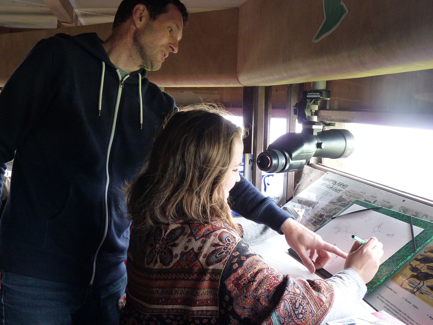 Jeder lässt sich mit seinem Skizzenheft im Beobachtungsposten nieder. Die Ferngläser ermöglichen eine unglaublich komfortable Beobachtung. Wir müssen zügig und effizient sein, da die Vögel nicht mit ihren Positionswechseln warten, bis wir unsere Zeichnungen fertiggestellt haben.