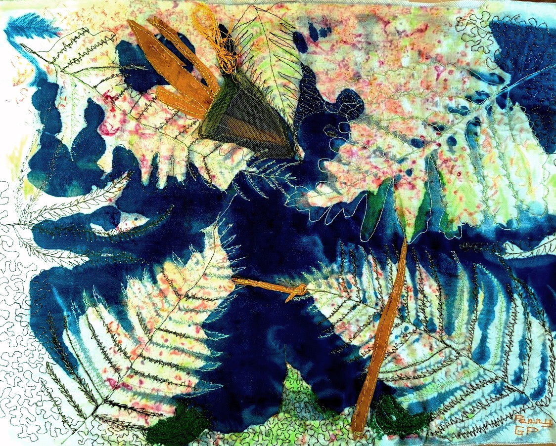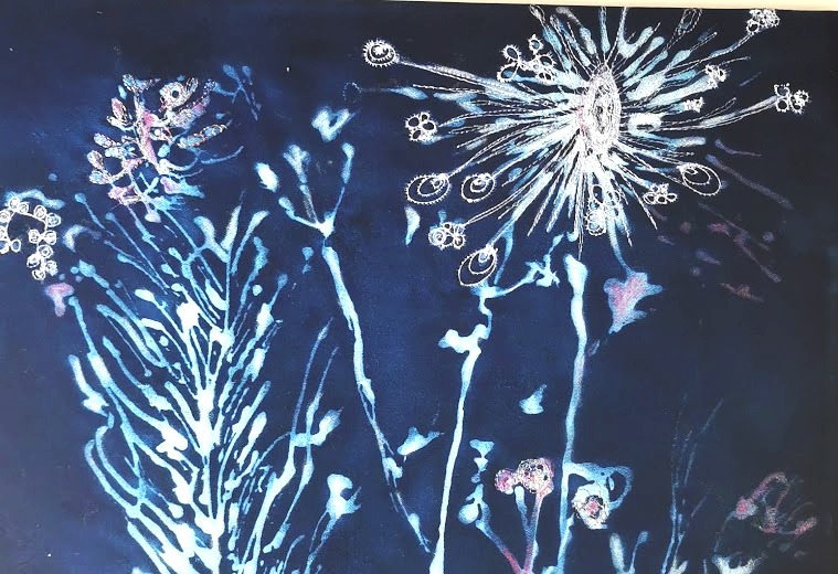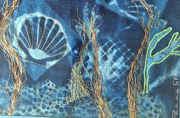 Im Rahmen der Programmation Textile der Mediatheken Sud Vendée Littoral stellt die Künstlerin Penny GP bis Ende Januar ihre Cyanotypien auf Stoffen und ihre bestickten Leinwände aus.
