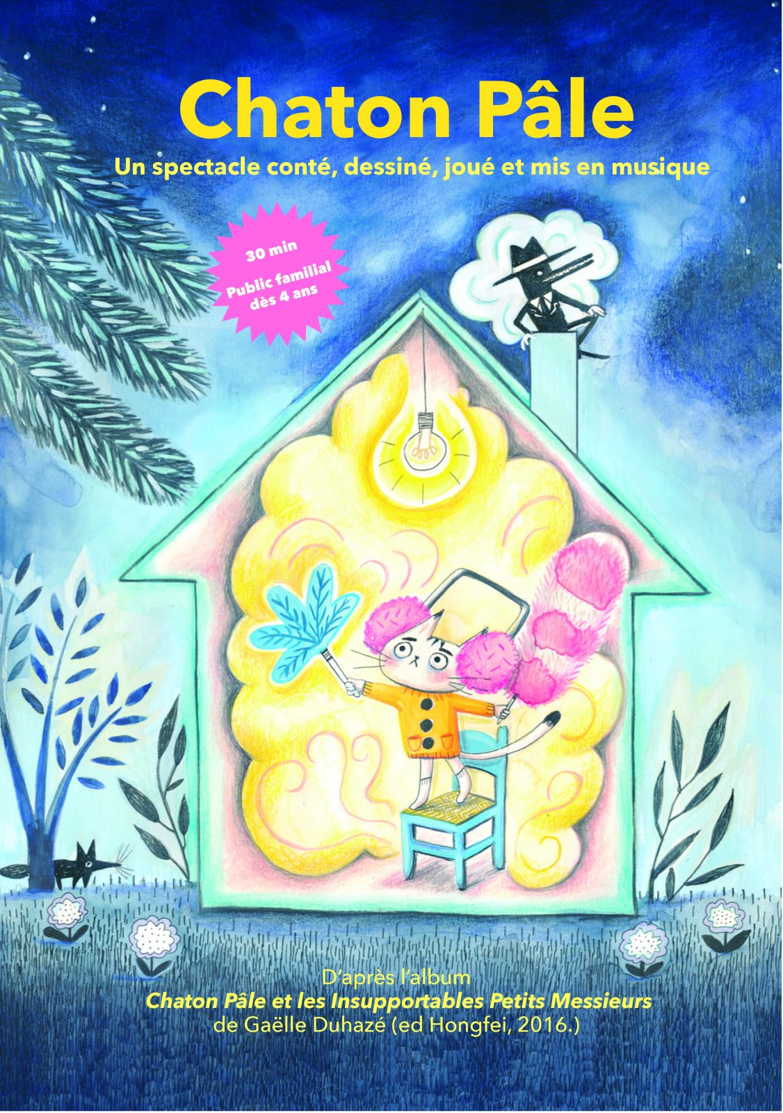 Blasses Kätzchen lebt in einem hübschen Haus am Waldrand. Alle nennen es Blasses Kätzchen, weil es nicht oft das Haus verlässt. Sobald es eine Pfote nach draußen setzen will, tauchen die Unausstehlichen Kleinen Herren auf, um es davon abzuhalten... Ein musikalisches und gezeichnetes Märchen voller Humor, Emotionen und Wendungen über die Öffnung zur Welt, um einen poetischen Moment mit der Familie zu verbringen!