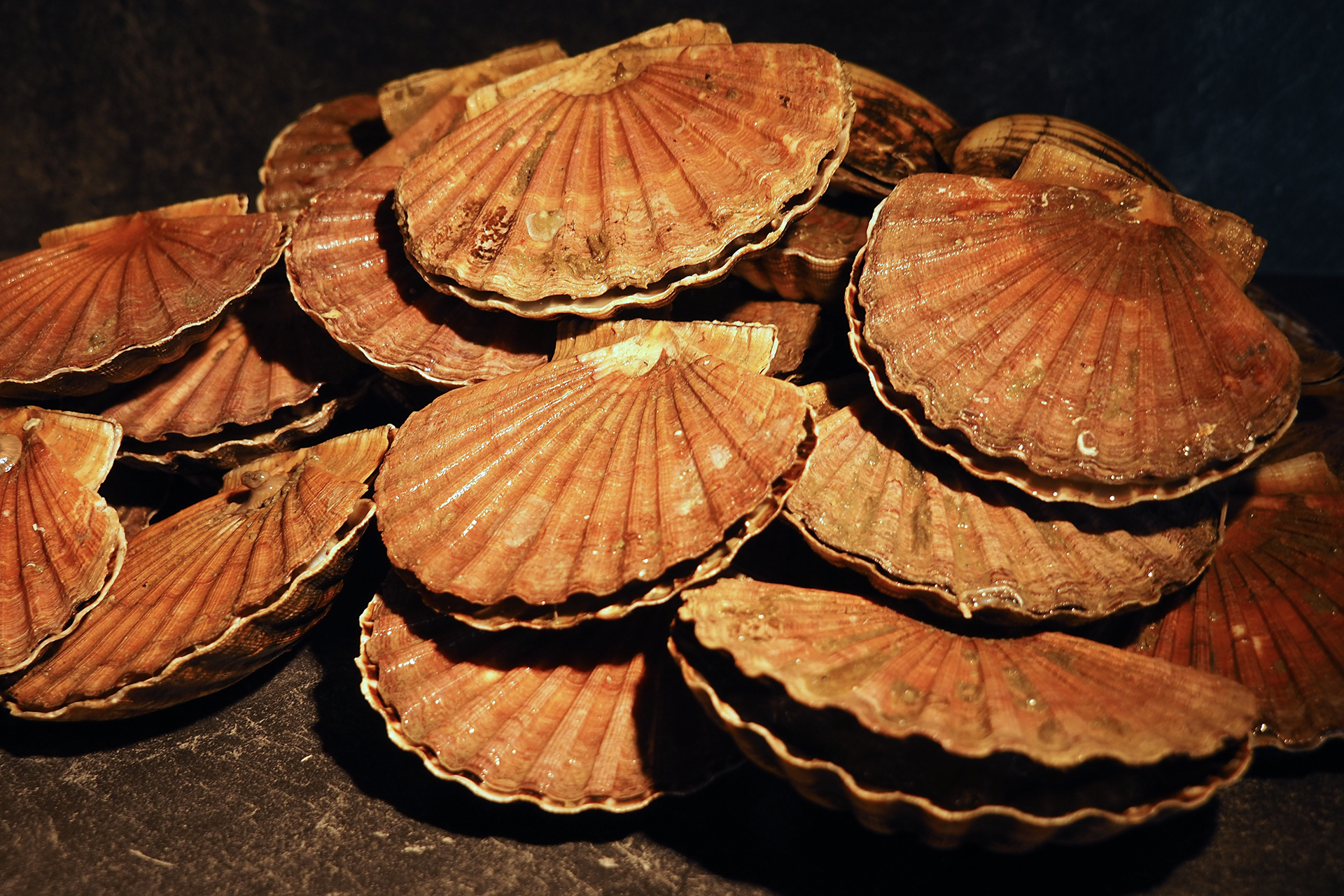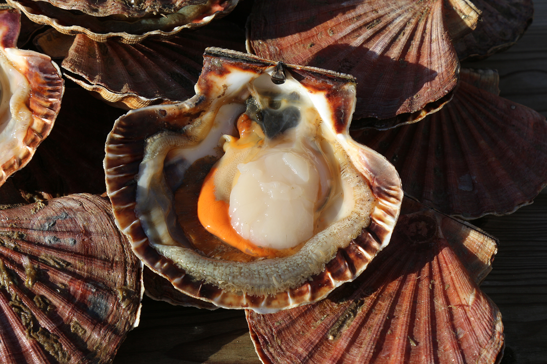 Sie sind mehr eine Jakobsmuschel Esser? Das kommt gut an, wir sind mitten in der Angelsaison. Die Boote kommen und gehen in den Hafen hinein und wieder hinaus, um ihre wertvolle Fracht zu entladen. Jakobsmuscheln sind die Mühe wert! Man muss den Dreh raus haben, ihn aus der Schale zu ziehen, ohne ihn zu beschädigen. Danach ist es ein echter Genuss.
