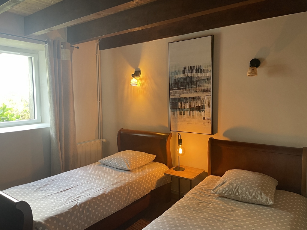 Die Unterkunft besteht im Erdgeschoss aus einer Einbauküche, einem Esszimmer und einem Wohnzimmer mit Kaminofen, der in die beiden Räume führt (Holz wird gestellt), einem Badezimmer mit italienischer Dusche und WC, 1 Schlafzimmer (2 Einzelbetten 90 cm) und 1 Schlafzimmer (1 Bett 140 cm).