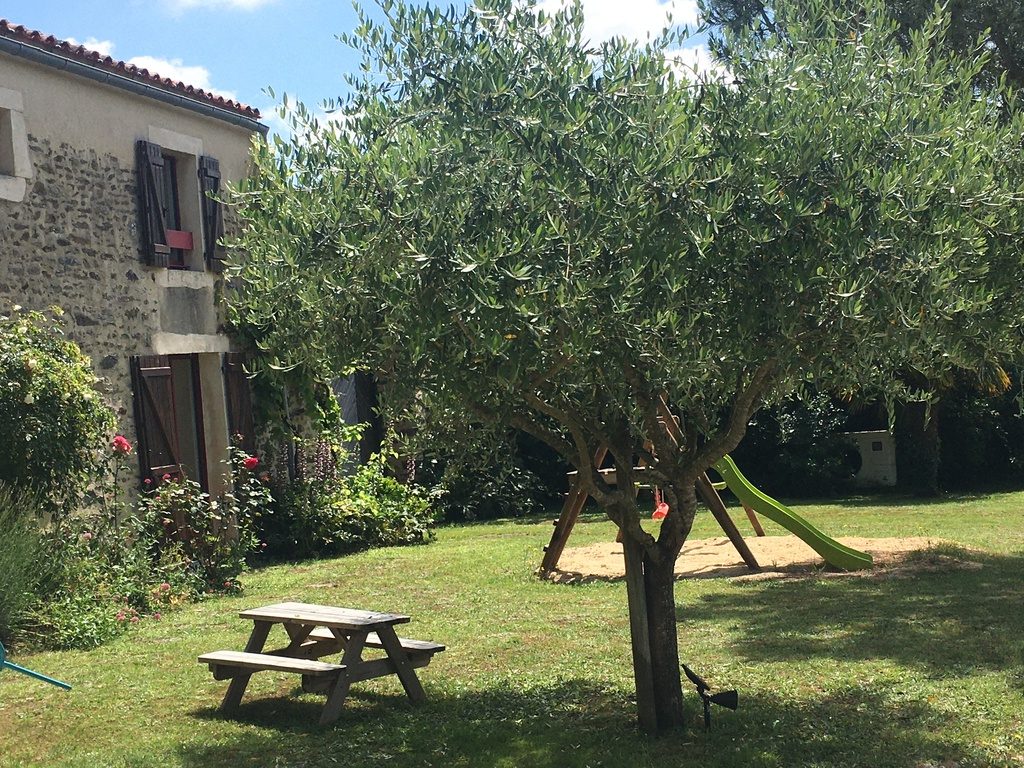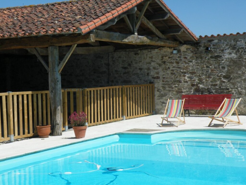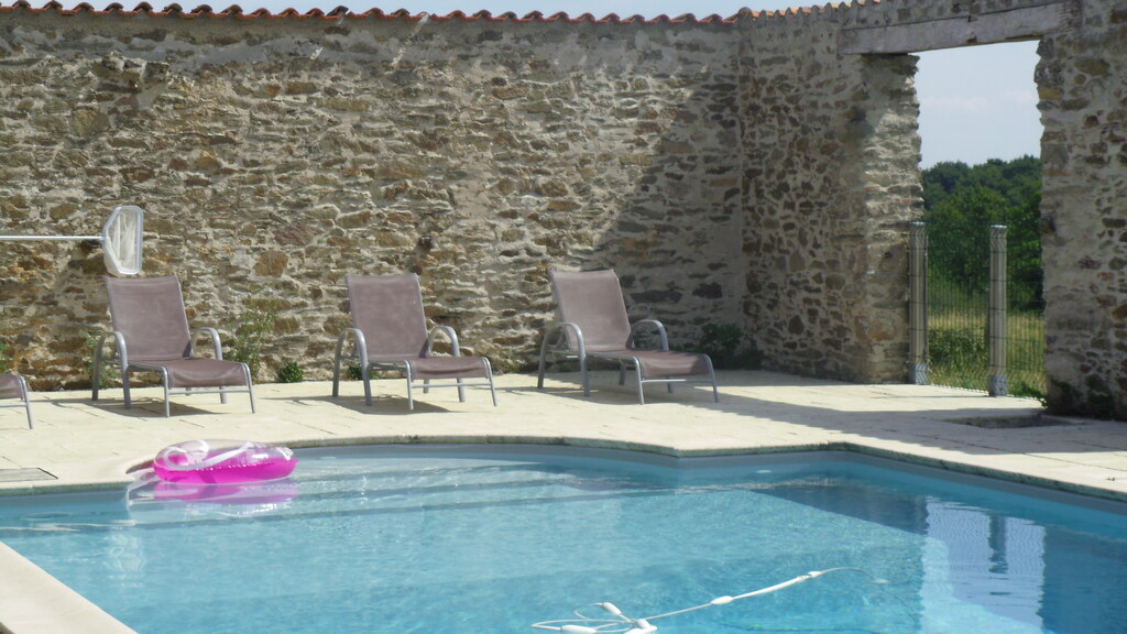 60 m² großer Innenhof auf Holzrosten mit Zugang zum privaten, vom 1. Juni bis 30. September beheizten Pool (10 m x 5 m), Liegestuhl, Tischtennisplatte, Klettergerüst für die Kinder.