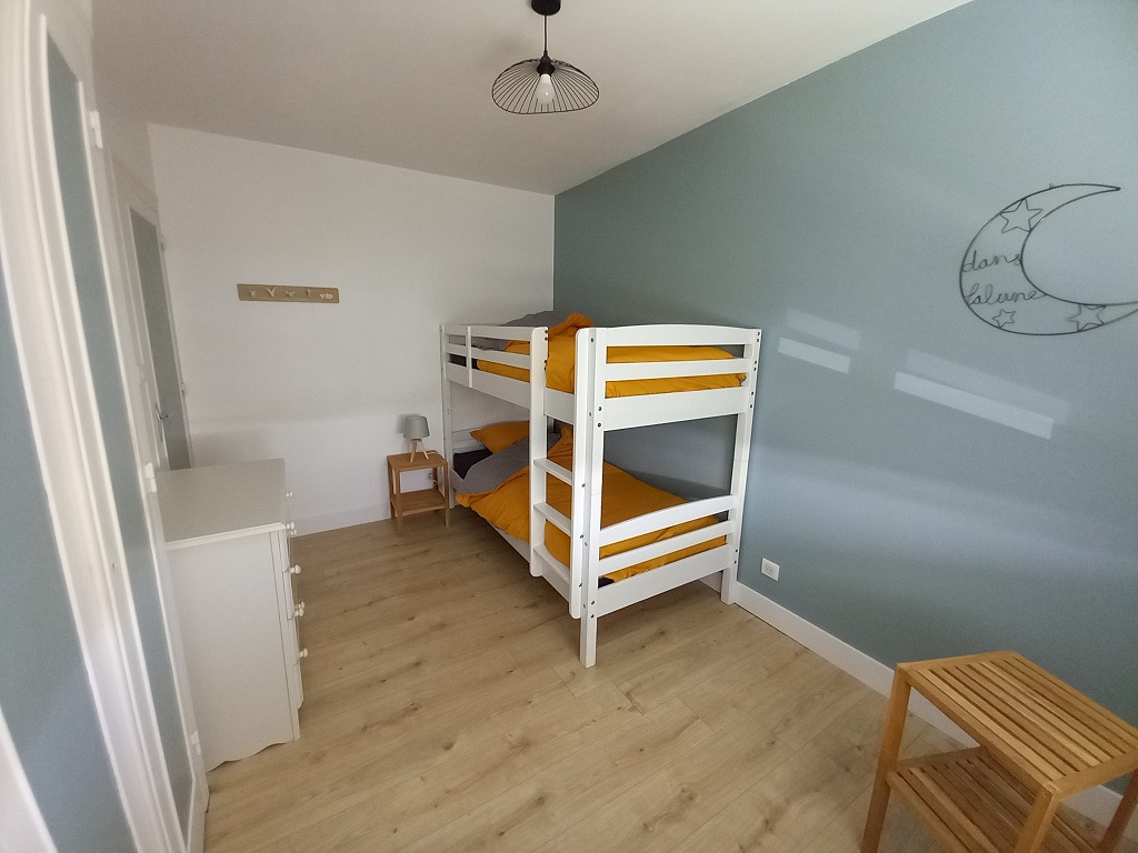 Im Obergeschoss: ein Badezimmer mit Dusche und Waschbecken, ein separates WC, ein Schlafzimmer mit einem Doppelbett, ein Schlafzimmer mit einem Etagenbett und ein letztes Schlafzimmer mit zwei Einzelbetten.