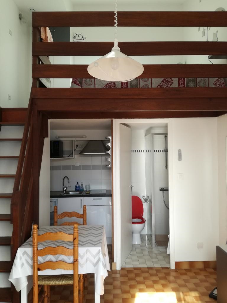 In einer ruhigen Residenz in der Nähe des Distelstrands in La Faute-Sur-Mer und 700m vom Stadtzentrum entfernt liegt dieses 20m² große Mezzanin-Studio für 2/3 Personen. Es besteht aus einem Wohnzimmer mit Sofa BZ 140, Flachbildfernseher, einer ausgestatteten Küchenzeile (kleiner Kühlschrank mit Gefrierfach, 2 Induktionskochplatten, Multifunktions-Mikrowelle), einem Badezimmer mit Dusche, Waschbecken und WC. Ein Zwischengeschoss mit einem 140cm breiten Bett und einem Kleiderschrank. Die Unterkunft verfügt außerdem über eine 17 m² große Terrasse in Südostlage mit Gartenmöbeln, Sonnenschirm und einem kleinen Elektrogrill. Nummerierter Privatparkplatz in der Residenz. Haustiere sind erlaubt.