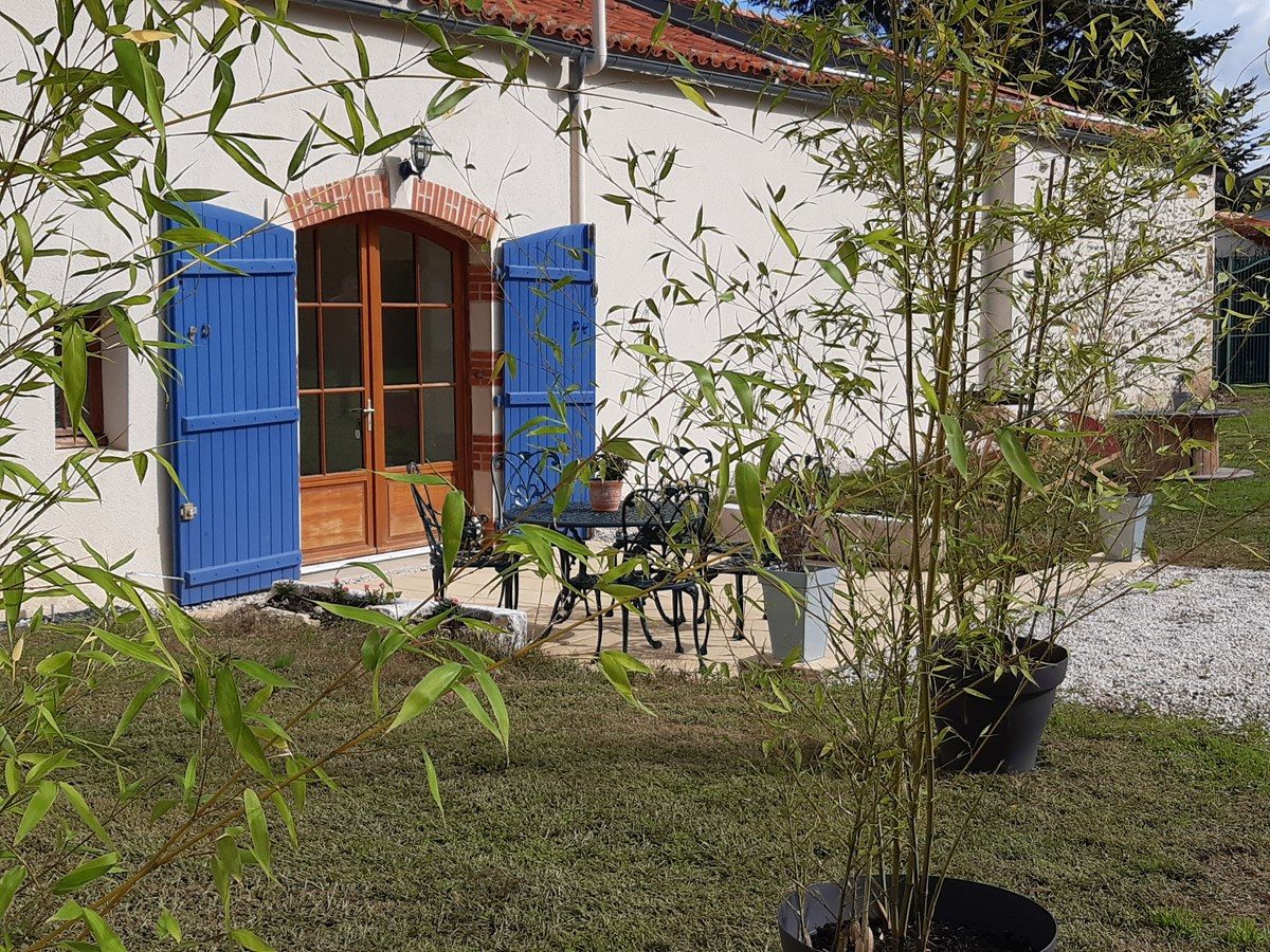 Blick auf den Garten mit privater Terrasse, Gartenmöbeln, Liegestühlen und Grill. Der Pool, der sich zwischen der Unterkunft und der Residenz der Eigentümer befindet, wird gemeinsam genutzt und ist nicht privat. Er ist durch die Umzäunung des Gebäudes und einen motorisierten PVC-Rollladen gesichert.