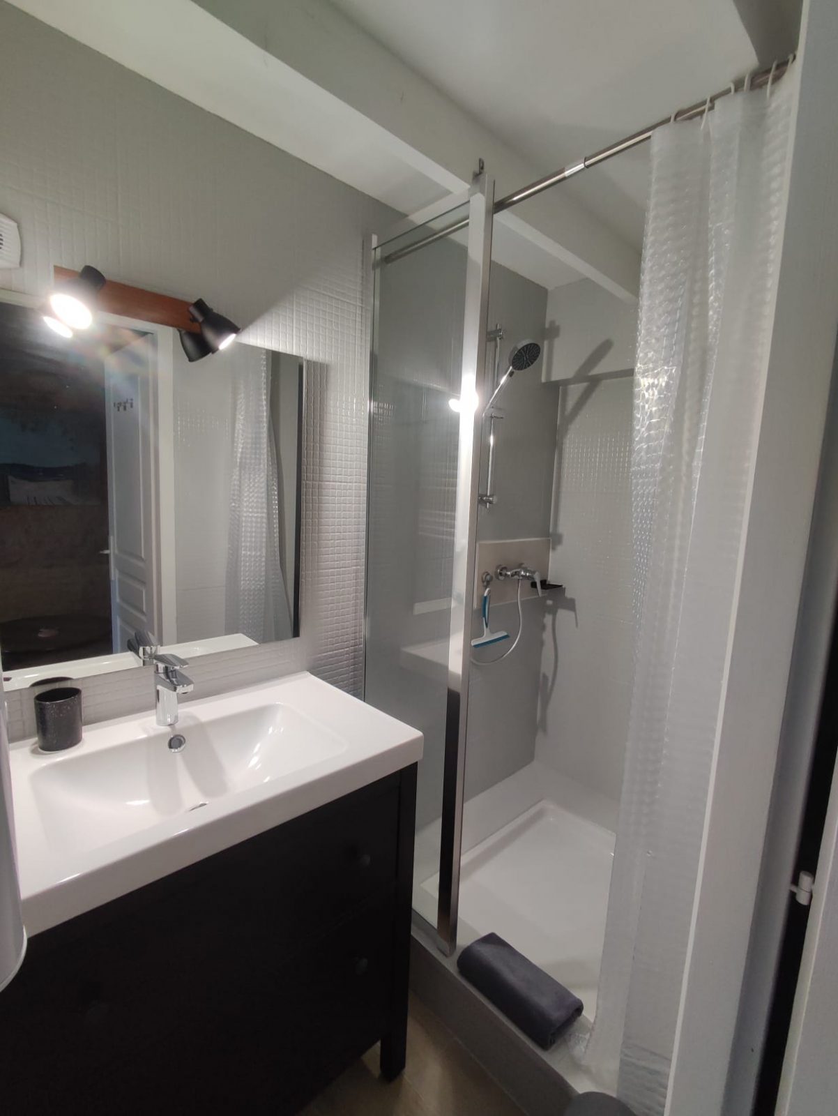 Erdgeschoss: Badezimmer mit Dusche, Waschbecken und Handtuchtrockner, separates WC.
